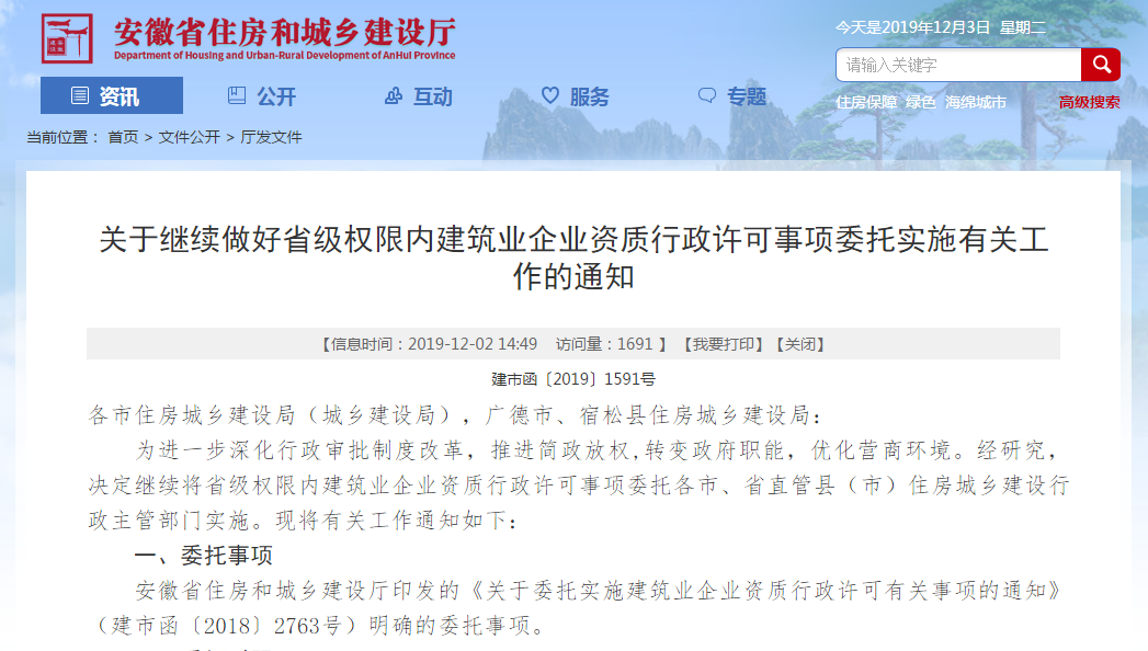 關(guān)于繼續(xù)做好省級權(quán)限內(nèi)建筑業(yè)企業(yè)資質(zhì)行政許可事項委托實(shí)施有關(guān)工作的通知(2019-12-3)