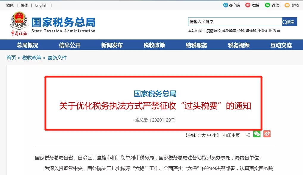 國家稅務總局 關(guān)于優(yōu)化稅務執(zhí)法方式嚴禁征收“過頭稅費”的通知 稅總發(fā)〔2020〕29號 國家稅務總局各省、自治區(qū)、直轄市和計劃單列市稅務局,國家稅務總局駐各地特派員辦事處,局內(nèi)各單位: 為深入貫徹黨中央、國務院關(guān)于扎實做好“六穩(wěn)”工作、全面落實“六保”任務的決策部署,認真落實國務院常務會議有關(guān)精神,進一步提升政治站位,充分發(fā)揮稅收職能作用,統(tǒng)籌推進疫情防控和支持經(jīng)濟社會發(fā)展,現(xiàn)就優(yōu)化稅務執(zhí)法方式、嚴禁征收“過頭稅費”有關(guān)要求進一步強調(diào)如下: 一、堅決防止違規(guī)征稅收費 各級稅務機關(guān)要進一步堅持依法規(guī)范組織收入原則不動搖,堅決壓實主體責任,嚴禁征收“過頭稅費”、違規(guī)攬稅收費以及以清繳補繳為名增加市場主體不合理負擔。堅決不搞大規(guī)模集中清欠、大面積行業(yè)檢查,堅決禁止采取空轉(zhuǎn)、轉(zhuǎn)引稅款等手段虛增收入。建立健全稅費收入質(zhì)量監(jiān)控和分析機制,利用大數(shù)據(jù)完善分區(qū)縣、分稅種、分時段的收入實時監(jiān)控體系,對收入畸高畸低等異常情況,及時分析排查,發(fā)現(xiàn)違法違規(guī)行為一律嚴肅處理,并建立典型案例通報制度,強化以案示警的作用。要積極向地方黨委、政府和相關(guān)部門匯報,進一步爭取對依法依規(guī)組織稅費收入的支持,避免采取不當?shù)慕M織收入措施。上級稅務部門要加強對下級稅務部門組織收入工作的監(jiān)督指導,想方設法幫助其化解征收工作面臨的矛盾和壓力。 二、不斷改進稅收風險管理 健全事前事中事后全流程稅收風險管理運行機制,進一步完善基于大數(shù)據(jù)的“雙隨機、一公開”“信用+風險”監(jiān)管方式,切實增強稅收風險管理的針對性和有效性,既有效防范和打擊偷騙稅行為,又盡最大可能不影響企業(yè)正常生產(chǎn)經(jīng)營。統(tǒng)籌發(fā)揮好稅收風險管理服務自主遵從和規(guī)范稅收秩序的功能,以服務為導向,強化事前精準提示提醒,不得組織對某一行業(yè)開展多年期、撒網(wǎng)式的風險推送和自查補繳稅費,重視和保障納稅人、繳費人對推送風險的自訴權(quán)益,促進其及時補正、精準糾錯,避免違法違規(guī)風險;以規(guī)范為目的,強化事中精準控制、事后精準應對,嚴厲精準打擊“假企業(yè)”“假出口”“假申報”等涉稅違法行為,防止稅收流失,維護國家稅收安全。 三、積極支持新業(yè)態(tài)健康發(fā)展 主動適應新經(jīng)濟不斷發(fā)展的新要求,持續(xù)完善支持電子商務、“互聯(lián)網(wǎng)+”等新興業(yè)態(tài)發(fā)展的稅收政策體系和管理服務措施,大力培育新興經(jīng)濟增長點。繼續(xù)堅持包容審慎的原則,不得專門針對某一新興業(yè)態(tài)、新型商業(yè)模式,組織開展全面風險應對和稅務檢查。積極運用稅收大數(shù)據(jù),深入分析線上經(jīng)濟發(fā)展情況,完善精準化、精細化稅收服務和管理措施,促進線上線下融合,支持新興業(yè)態(tài)持續(xù)健康發(fā)展。 四、不折不扣落實稅費優(yōu)惠政策 進一步落實落細黨中央、國務院出臺的系列稅費優(yōu)惠政策,不斷鞏固和拓展政策實施成效。結(jié)合疫情防控,動態(tài)更新《支持疫情防控和經(jīng)濟社會發(fā)展稅費優(yōu)惠政策指引》,及時通過“云課堂”、線上答疑等方式,回應稅收熱點問題,深入開展針對性政策解讀和輔導,助力納稅人、繳費人應享盡享。適時開展減稅降費督查,狠抓發(fā)現(xiàn)問題整改,強化跟蹤問效,暢通政策落實“最后一公里”,確保減稅降費政策紅利直達困難企業(yè)、直達市場主體。 五、持續(xù)優(yōu)化辦稅繳費服務 大力鞏固拓展“非接觸式”辦稅繳費服務,進一步擴大網(wǎng)上辦稅繳費事項范圍,確保主要辦稅繳費事項均能網(wǎng)上辦理。簡化優(yōu)化稅費申報手續(xù),加快推進增值稅、消費稅、城市維護建設稅主附稅合并申報和財產(chǎn)行為稅一體化納稅申報。繼續(xù)深化與銀保監(jiān)部門和銀行業(yè)金融機構(gòu)的合作,搭建“稅銀互動”信息共享平臺,擴大受益范圍,增進線上辦理便利,更好滿足企業(yè)特別是民營企業(yè)和小微企業(yè)信貸需求,助力緩解市場主體融資難題。 六、切實轉(zhuǎn)變工作作風 各級稅務機關(guān)要根據(jù)經(jīng)濟社會發(fā)展的新形勢新情況,創(chuàng)新工作思路和工作方式,不能用老辦法解決新問題,不能用泛泛的方法解決個性化的問題。要妥善處理好稅收與經(jīng)濟社會發(fā)展的關(guān)系,準確把握稅務執(zhí)法的時度效,提高工作的精準性和精細度,防止粗放式管理和執(zhí)法。要通過12366納稅服務熱線、稅務網(wǎng)站等渠道和實地走訪、第三方調(diào)查等方式,深入開展向納稅人、繳費人問需活動,積極幫助紓困解難,及時回應社會關(guān)切,以作風建設的新成效,促進稅收工作質(zhì)效新提升。 國家稅務總局 2020年6月18日
